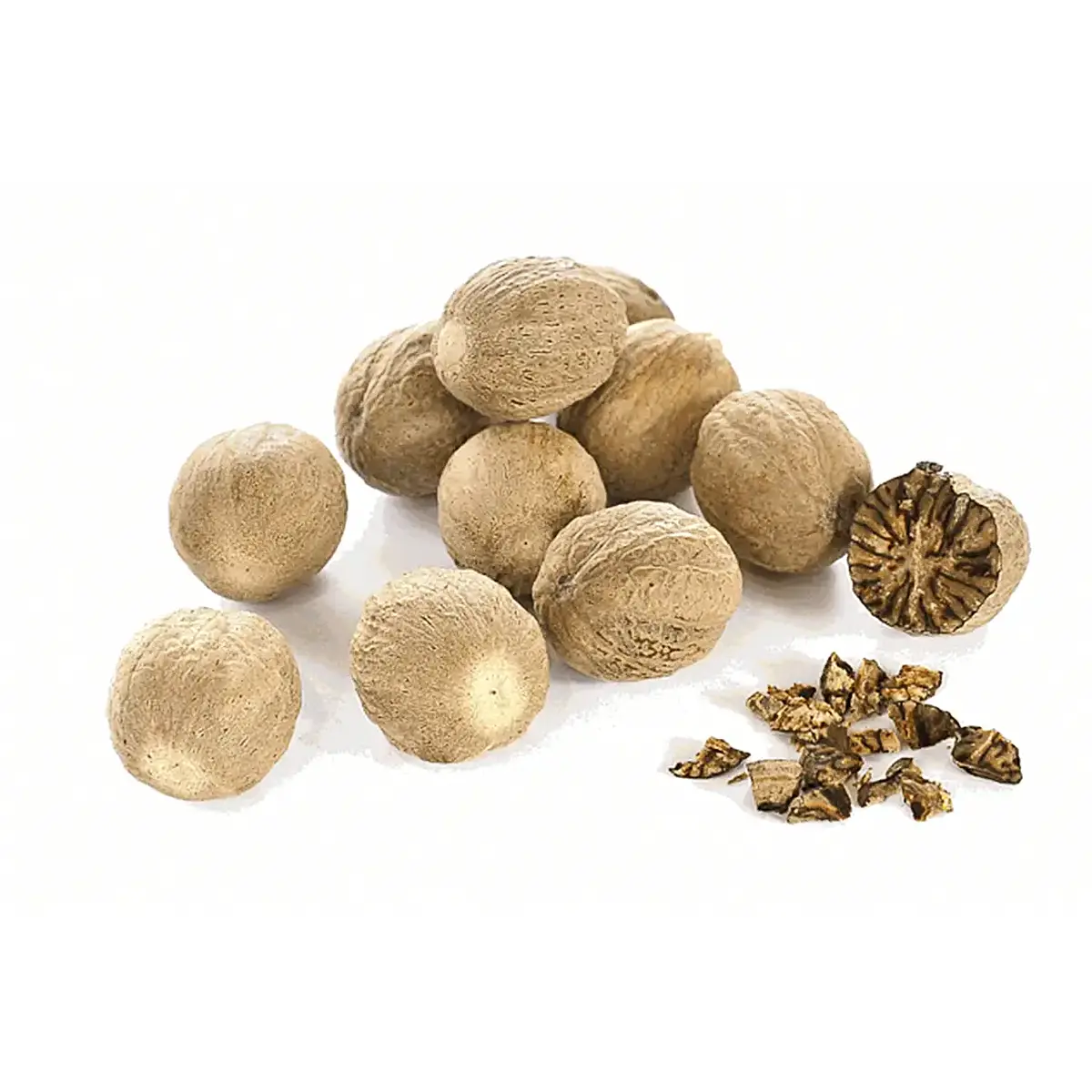La nuez moscada en trozos es la semilla del árbol tropical Myristica fragrans, cortada en fragmentos más pequeños.