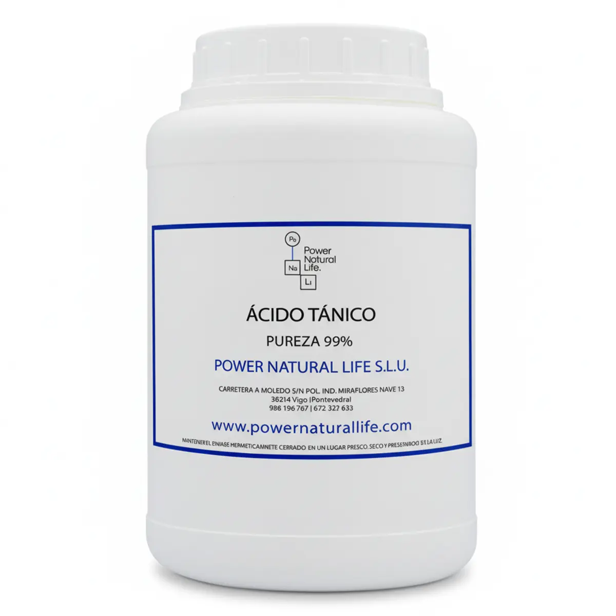 El ácido tánico (tanino hidrolizable, CAS 1401-55-4) es un polifenol vegetal de alto peso molecular obtenido principalmente de agallas de Quercus infectoria y otras fuentes vegetales ricas en taninos. Se presenta en forma de polvo fino de color marrón, soluble en agua y en etanol, con propiedades astringentes, quelantes y antioxidantes ampliamente documentadas en sus aplicaciones técnicas e industriales.